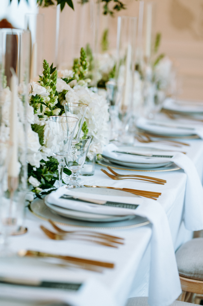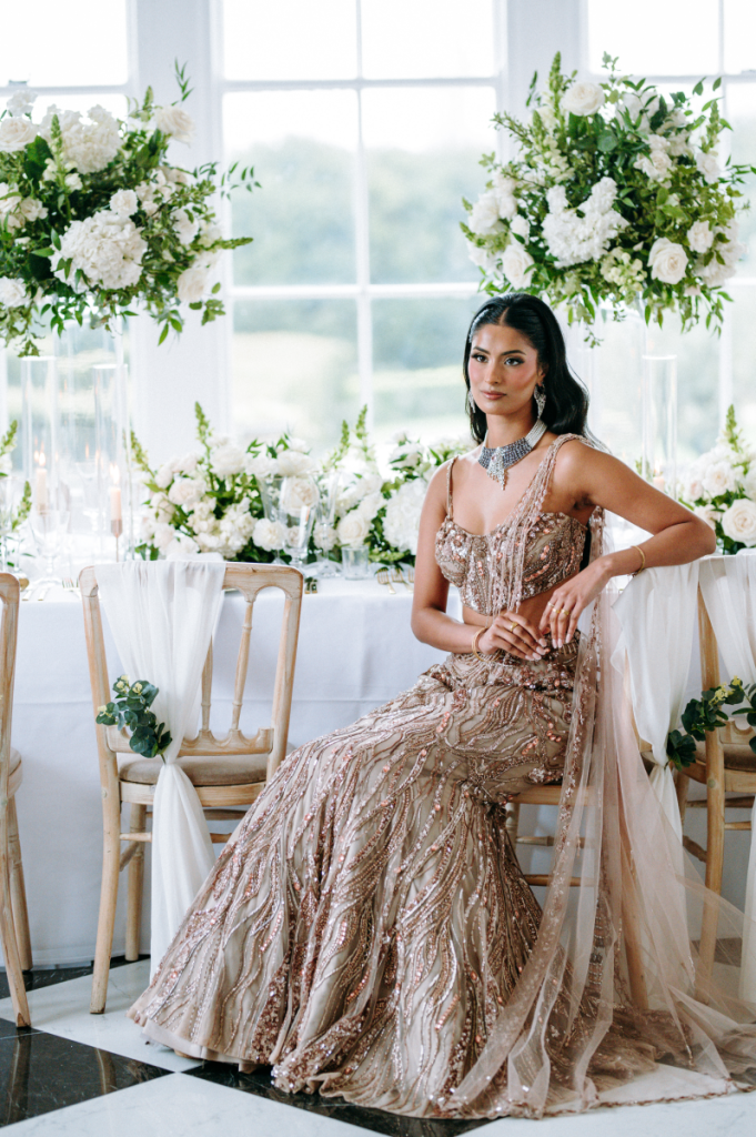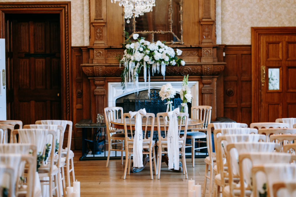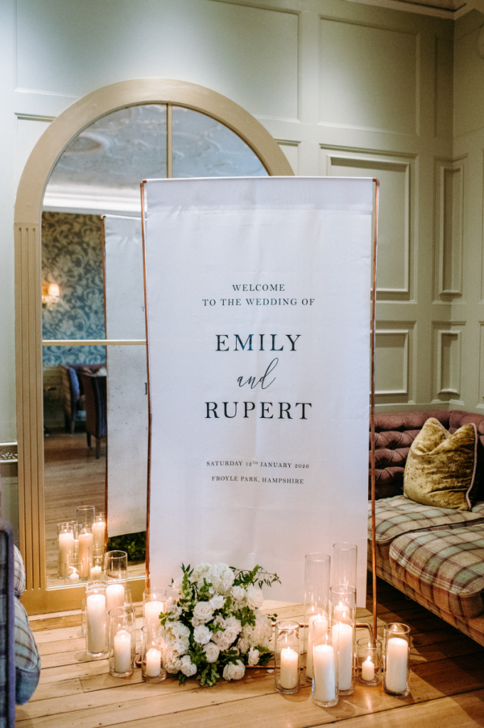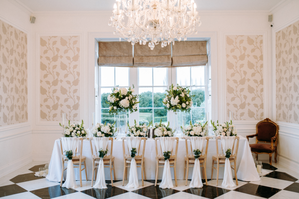 Set against the grandeur of this luxury Hampshire venue, our monochrome suite was designed to feel both contemporary and refined — perfect for couples seeking a clean, editorial aesthetic with a touch of understated drama.