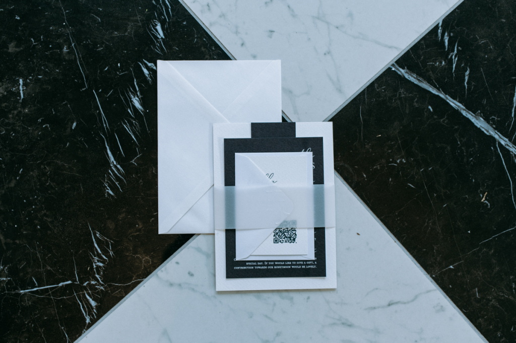 At the heart of the suite is a clean, minimalist invitation, paired with contrasting inserts and a sleek black envelope. Subtle details — from delicate script typography to layered card stocks — add depth without overwhelming the design.